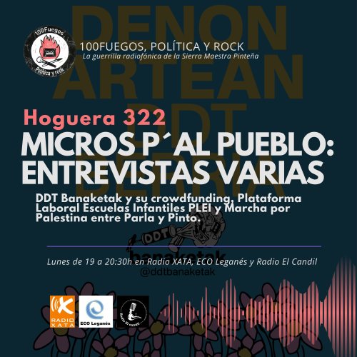 ¡Variedad de voces! Entrevistamos a DDT Banaketak sobre su crowdfunding, a la Plataforma Laboral Escuelas Infantiles PLEI sobre la huelga en el sector y a representantes de la Marcha por Palestina entre Parla y Pinto del próximo 25 de abril. Sonaron Los Gandules, Brigade Loco, Gurs, Uger, Forma, Arakil, Holocausts, Dropkick Murphys, Cicatriz y La Gossa Sorda.